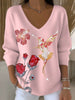 Γυναικείο διαμαντένιο πουλί και τριαντάφυλλο κεντημένο ροζ V-λαιμόχημα
