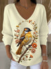 Γυναικείο χαριτωμένο πουλί κεντημένο ανοιχτό κίτρινο πουλόβερ V-λαιμό λαιμό