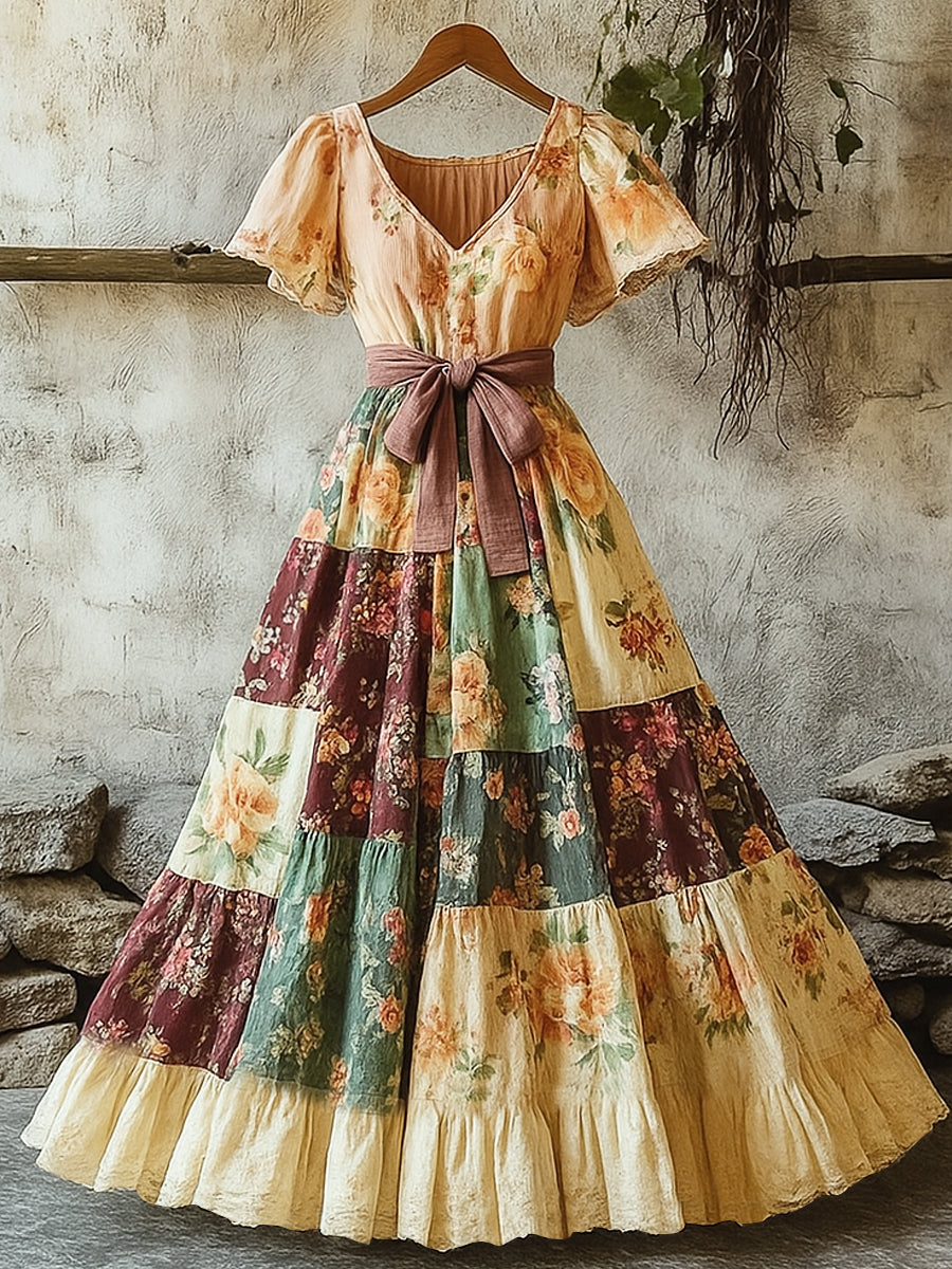 Γυναικείο Retro αγροτική λουλουδιά τυπωμένο V-λαιμό κοντό μανίκι βαμβάκι Maxi φόρεμα βαμβάκι
