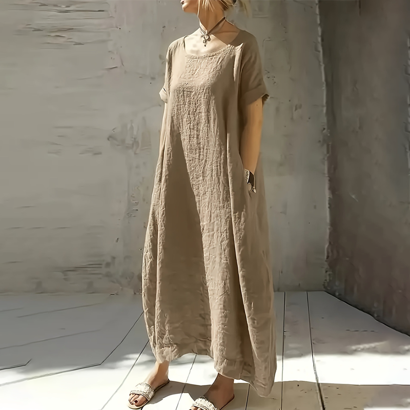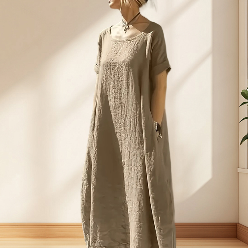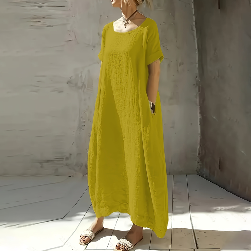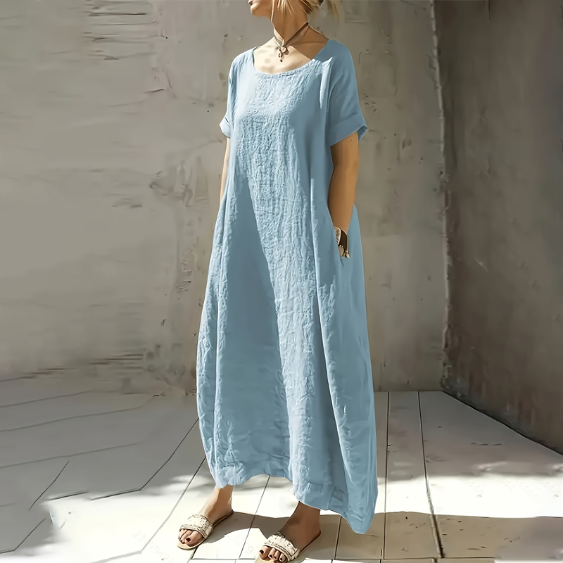 ΔΙΑΧΡΟΝΙΚΟΣ ΣΧΕΔΙΑΣΜΟΣ: Κλασικό μακρύ φόρεμα με κοντό μανίκι και στρογγυλό λαιμό σε μονόχρωμες αποχρώσεις για μια κομψή και ευέλικτη εμφάνιση. Ο μινιμαλιστικός σχεδιασμός του το καθιστά εύκολο να συνδυαστεί με αξεσουάρ, καθιστώντας το ένα βασικό κομμάτι της ντουλάπας για κάθε εποχή.