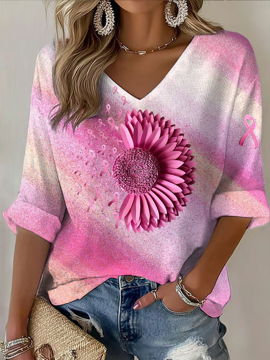 Γυναικείο ροζ κορδέλα εκτύπωση Καθαρή μακριά μανίκι T-Shirt